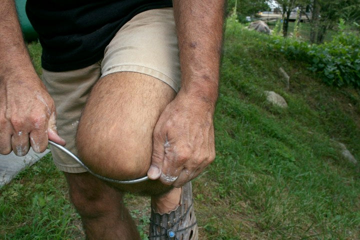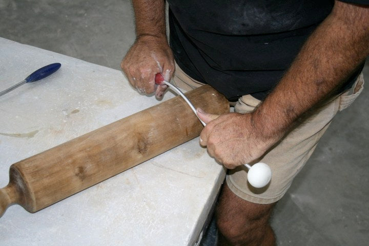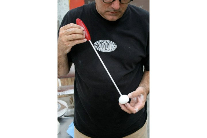 The Bump is designed to extend the potter’s reach up to 18 inches while working in a hollow form. This gives the leverage needed to bump out, alter, or heal seams in the clay. The Bump's aluminum rod is stiff but can be altered to suit individual needs for throwing or sculpting clay. Please specify if you would like this tool shipped straight or set in an S curve (see photos). The sponge end is a dense, chamois-like material with a hard center.